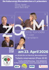 Eine irre “Videokonferenz” mit den Mitteln des Theaters. Diese Inszenierung verwandelt eine zweidimensionale Zoom-Konferenz in ein dreidimensionales Theatererlebnis voller Tempo, Witz und irrwitziger Einfälle. Es geht um Kommunikationspannen, um absurde Missverständnisse, um das uralte Drama zwischen Geschwistern - und natürlich um die Frage, warum eine so einfache Aufgabe wie die Wahl eines Geschenks zu einer veritablen Krise ausarten kann. Ob die vier am Ende wirklich das perfekte Geschenk finden oder ob sie sich bis zur Silberhochzeit der Eltern weiter streiten, bleibt abzuwarten. Sicher ist nur: Das Publikum erwartet ein Abend voller scharfsinniger Dialoge, ironischer Spitzen und unerwarteter Wendungen.