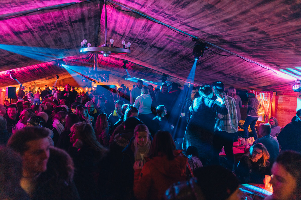 DJ, Tanzfläche und lockere Party-Atmosphäre in der Almhütte